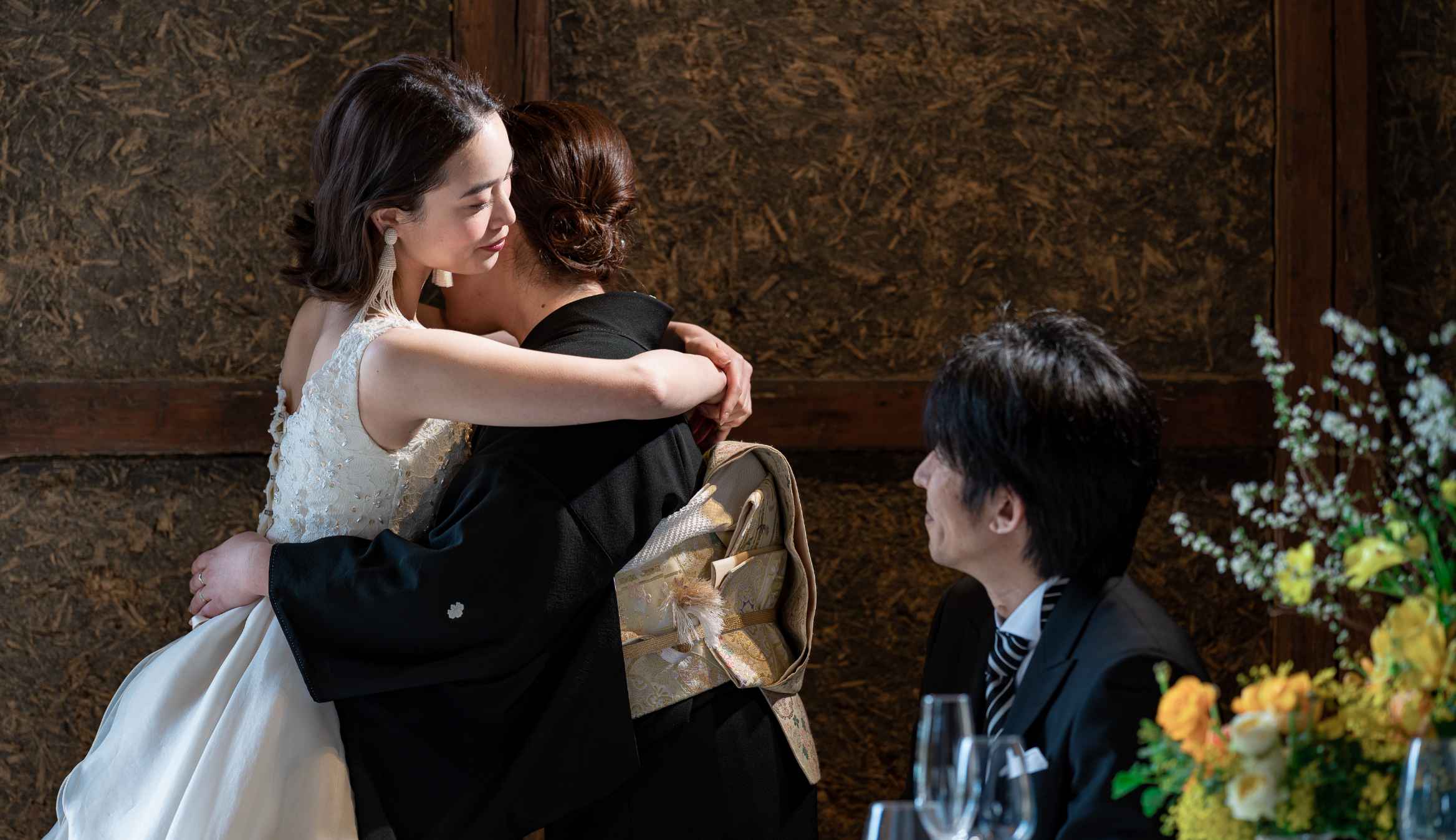 縁の契りや三々九度など、日本の古式ゆかしい雰囲気を大切にしつつ、演出やアイテムはおふたりらしさを織り交ぜたオリジナル和婚式も可能。挙式後の温かい雰囲気そのままに、スムーズにパーティがスタートできるのも宴内挙式の魅力ポイント。