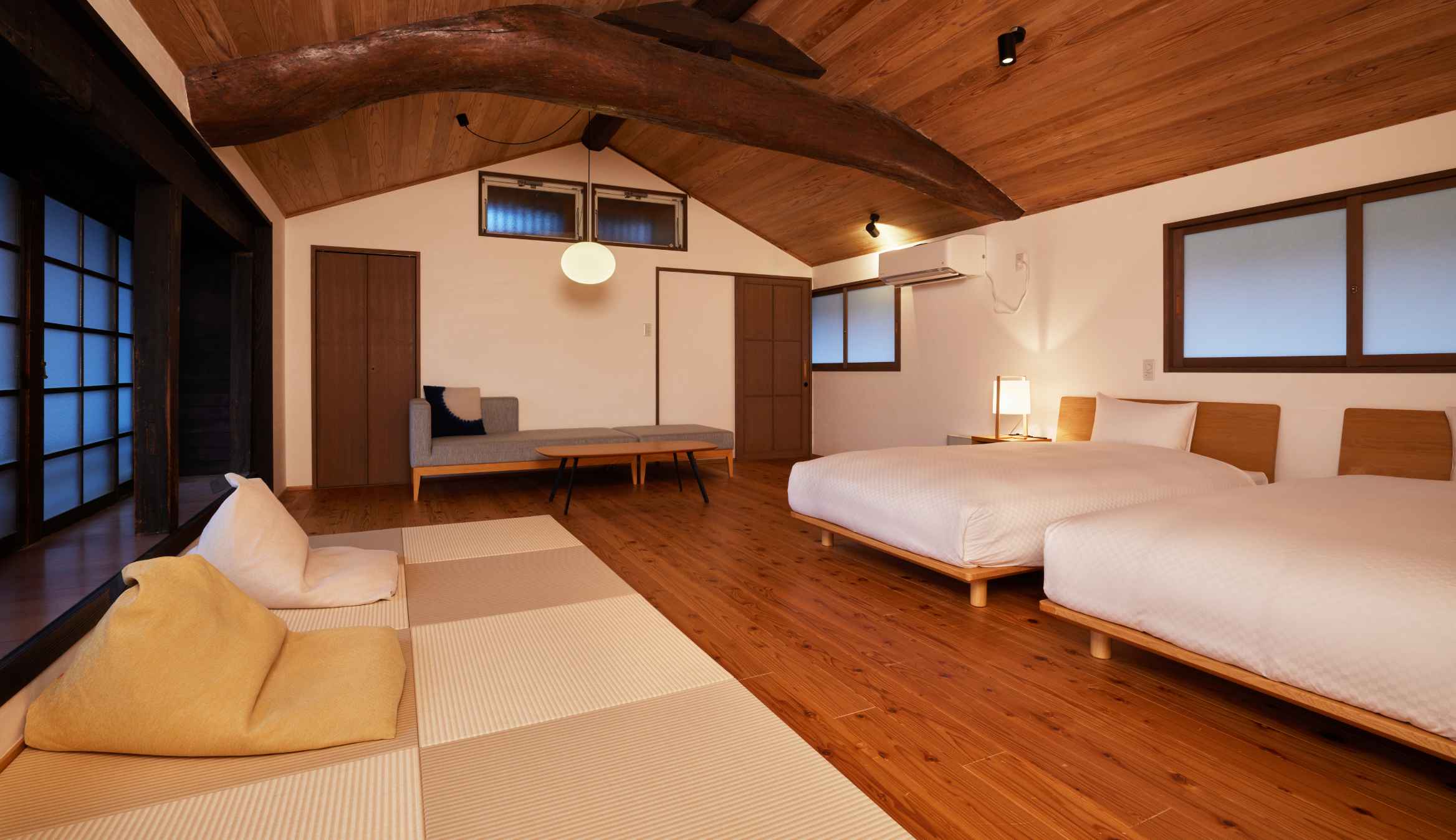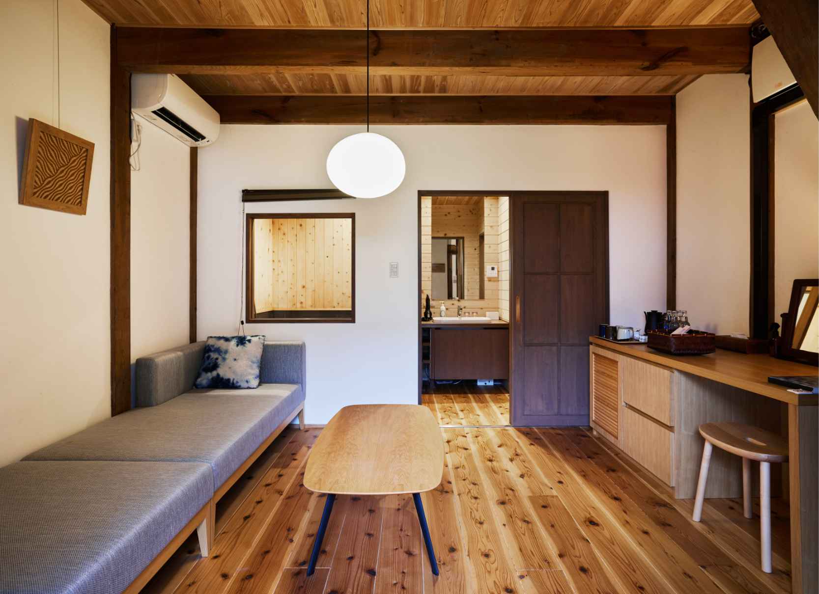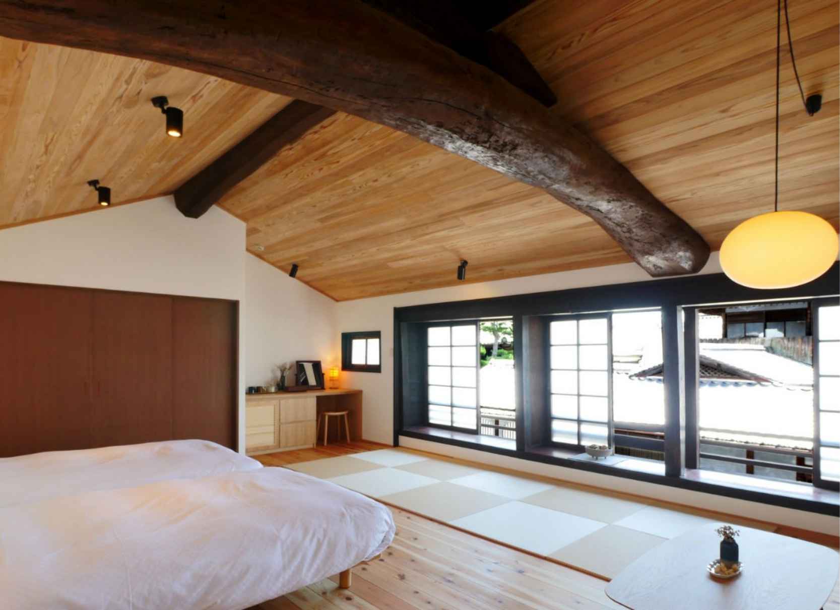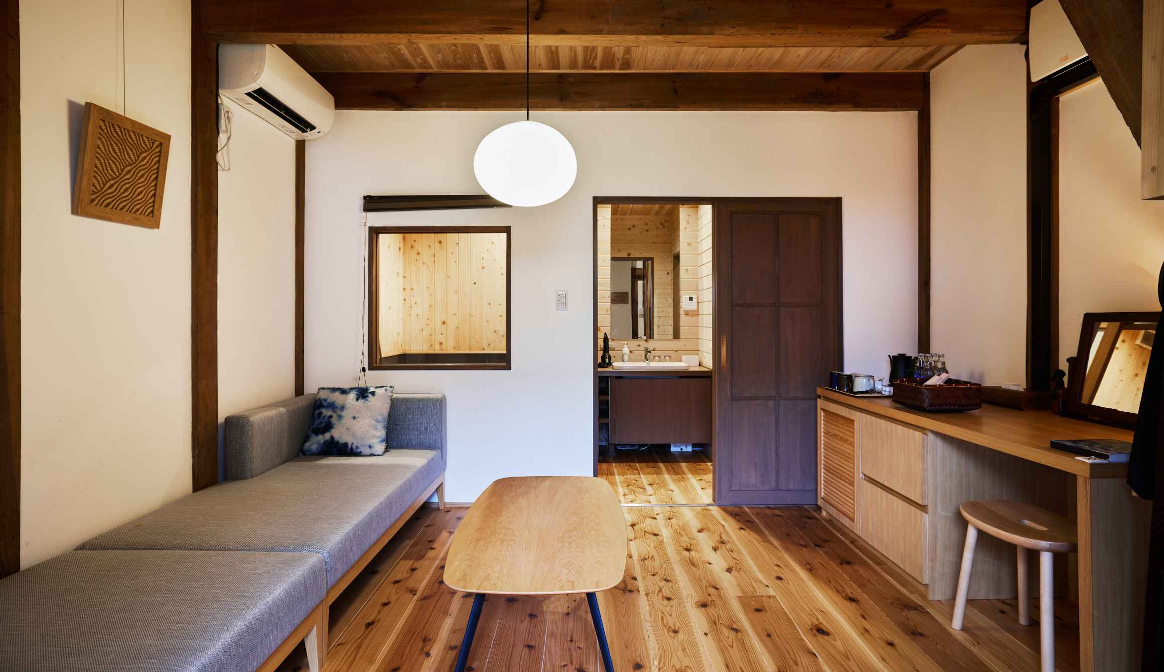 TVや時計、明々とした照明を置かないことで、日常の喧騒を離れたゆっくりしたひと時をお過ごしいただけます。また現代の快適性を加えつつ、できるだけ当時の空間を残しています。