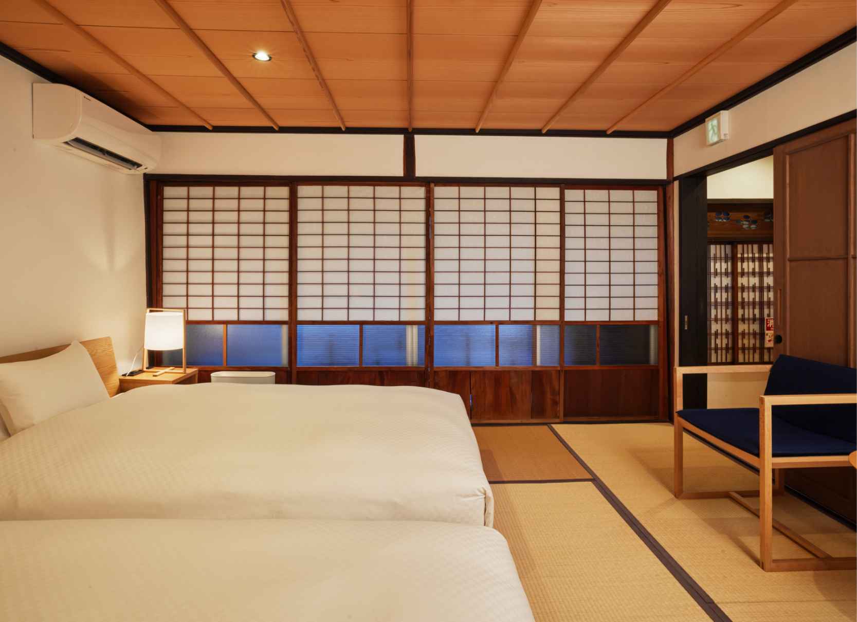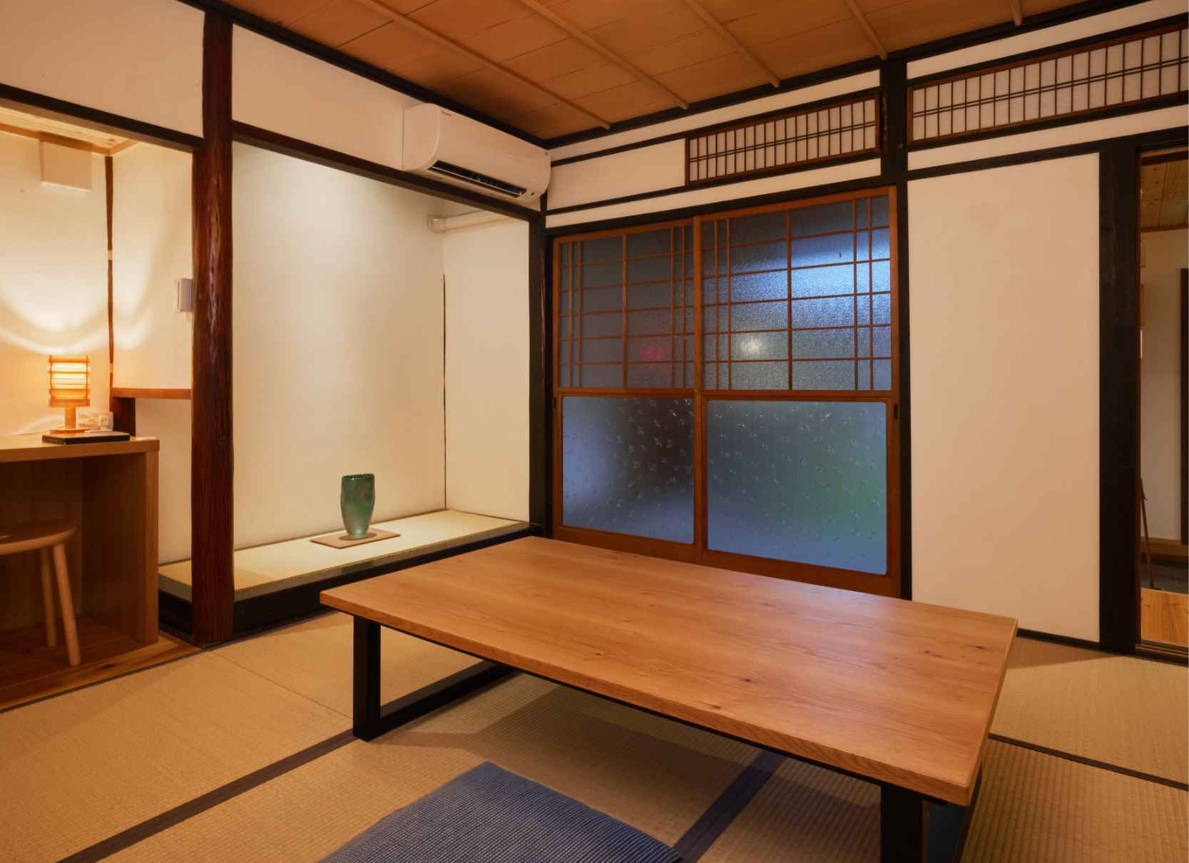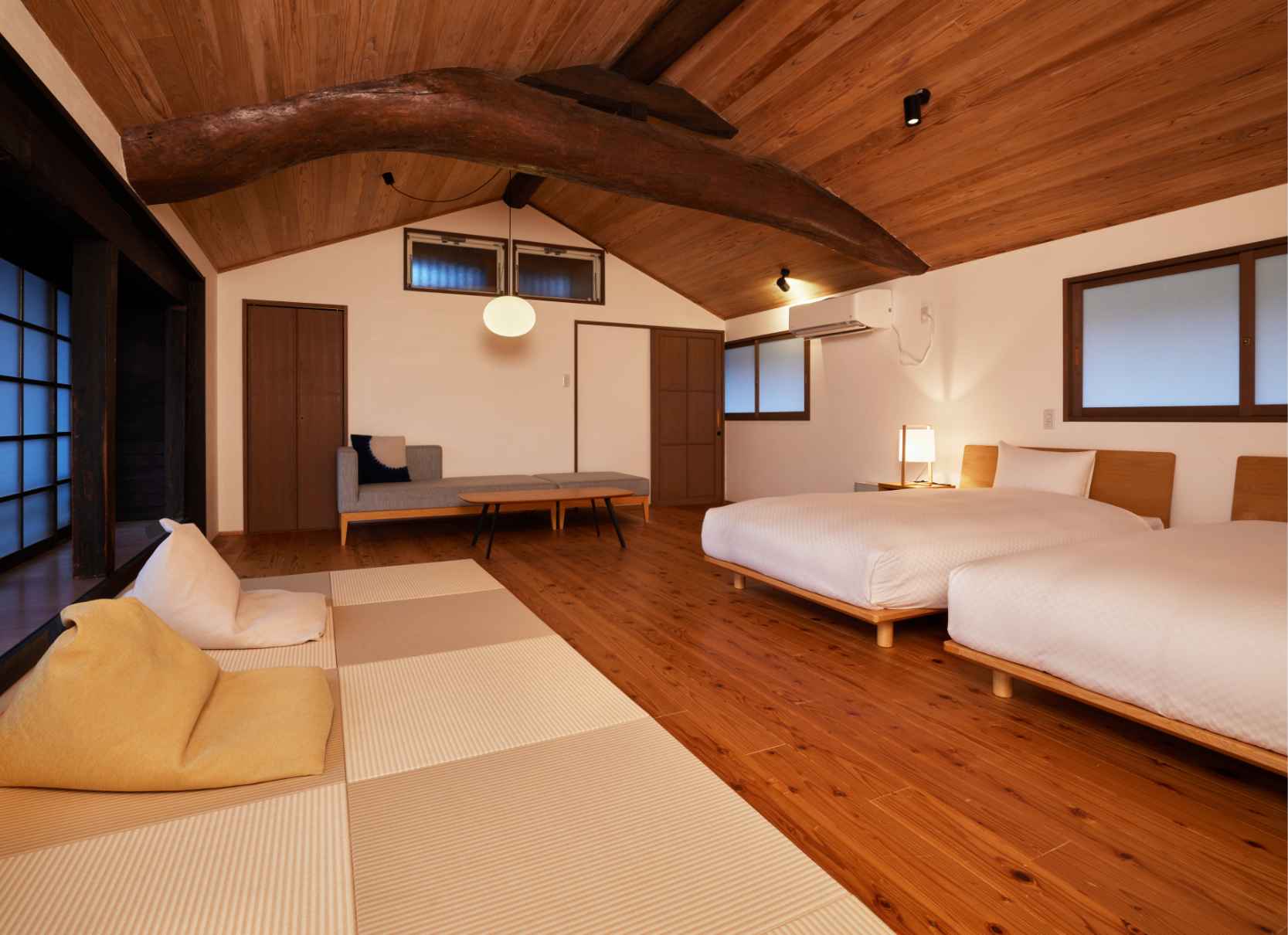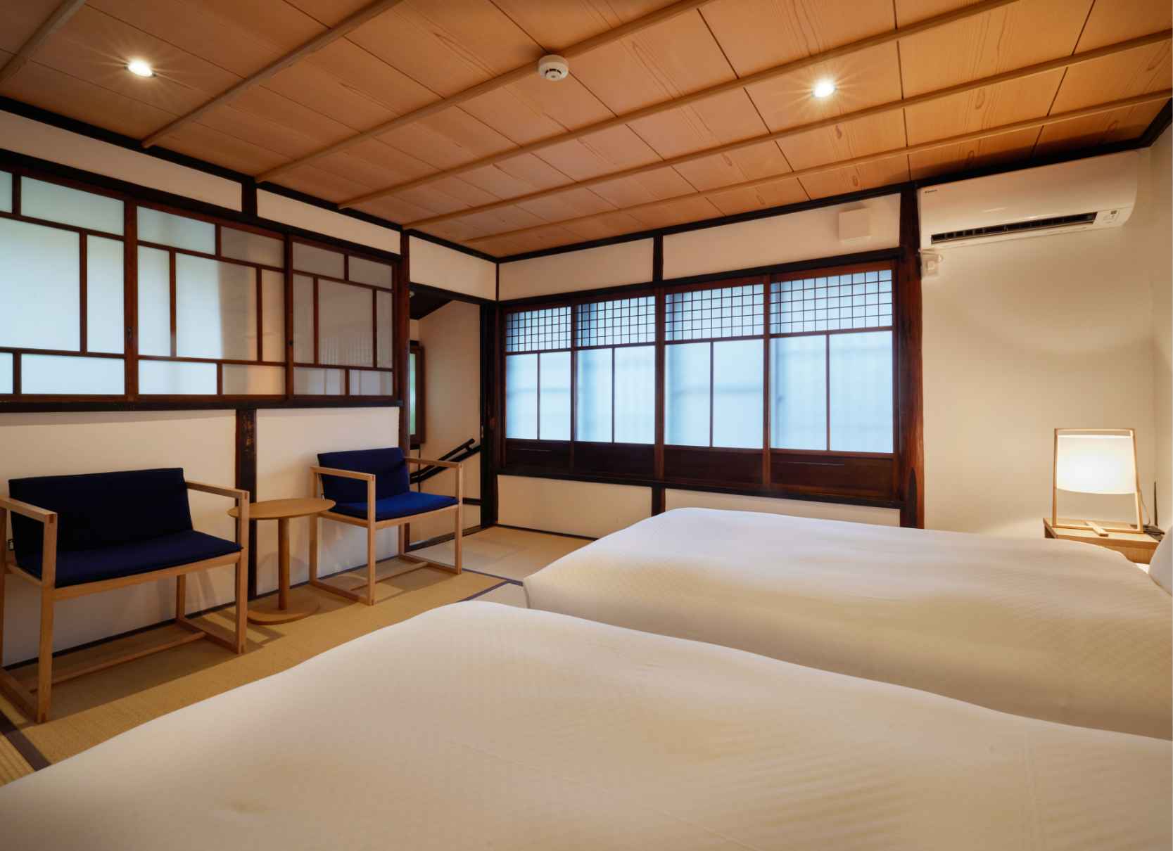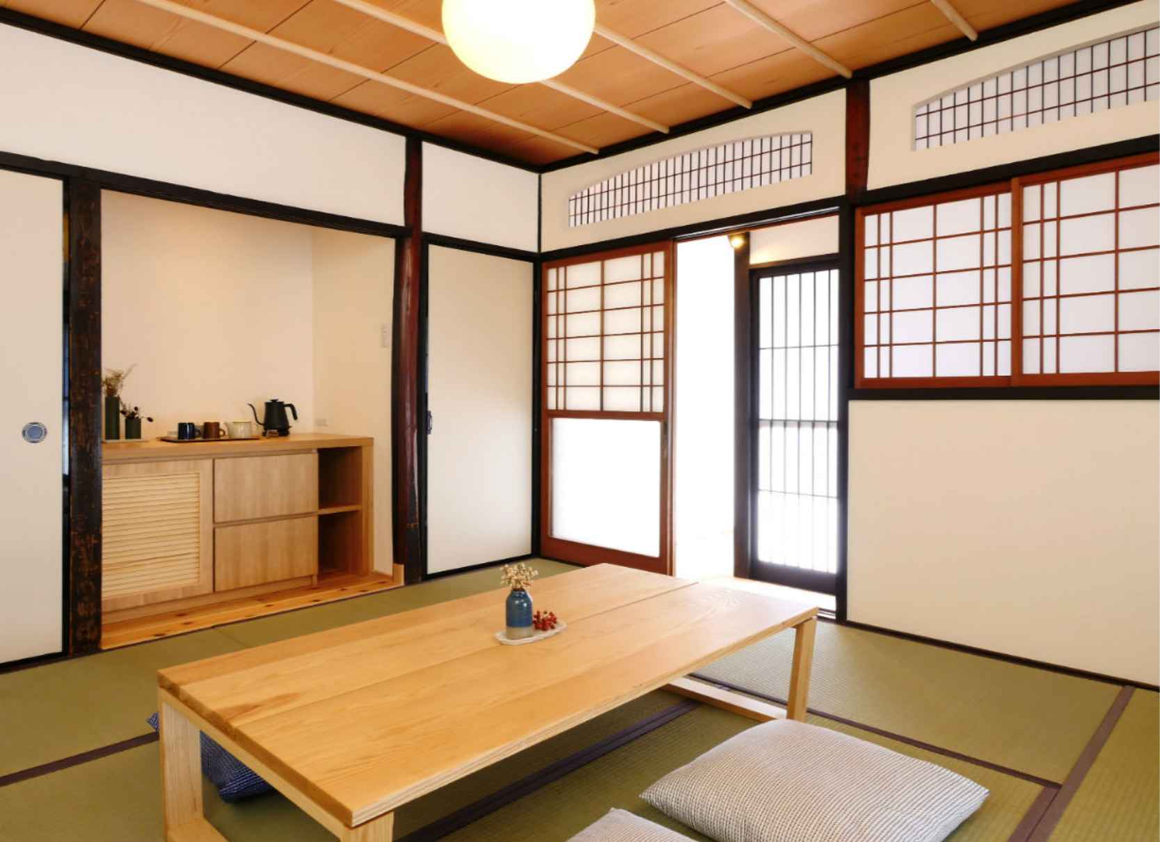 TVや時計、明々とした照明を置かないことで、日常の喧騒を離れたゆっくりしたひと時をお過ごしいただけます。また現代の快適性を加えつつ、できるだけ当時の空間を残しています。