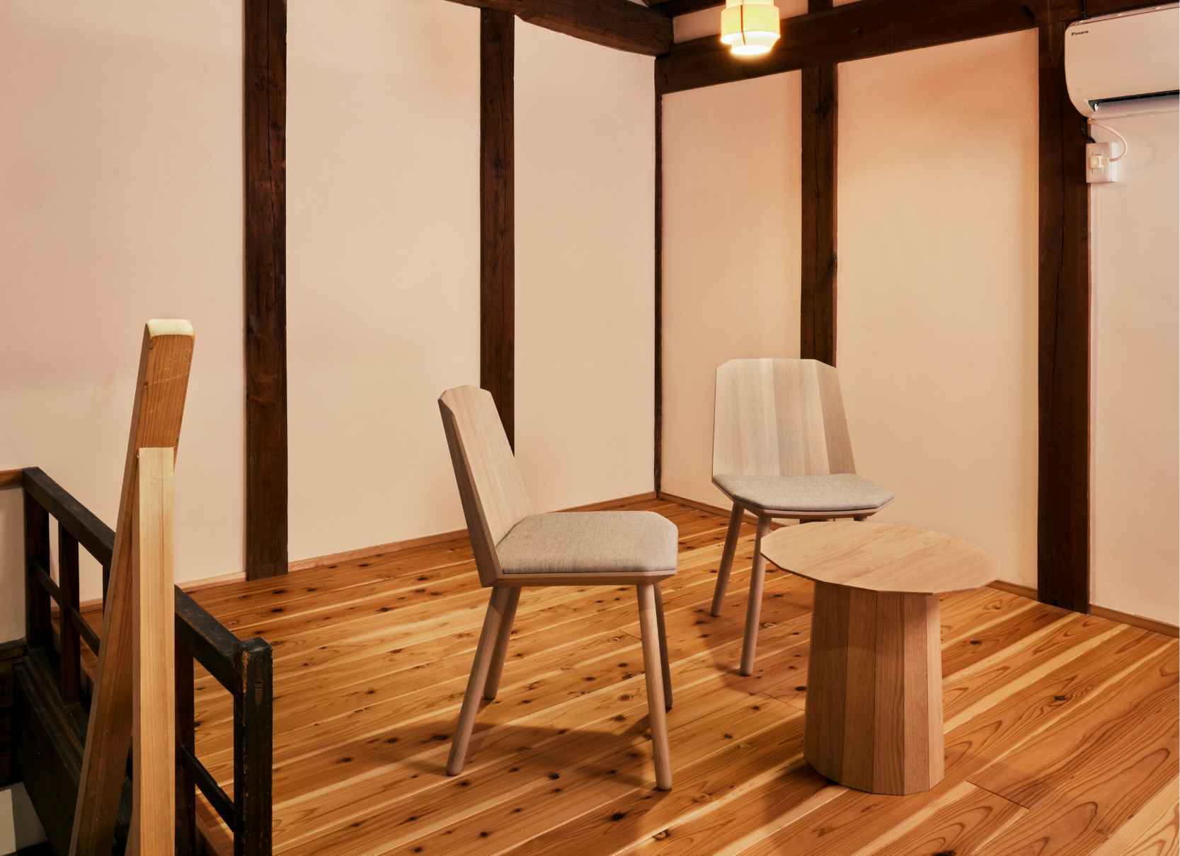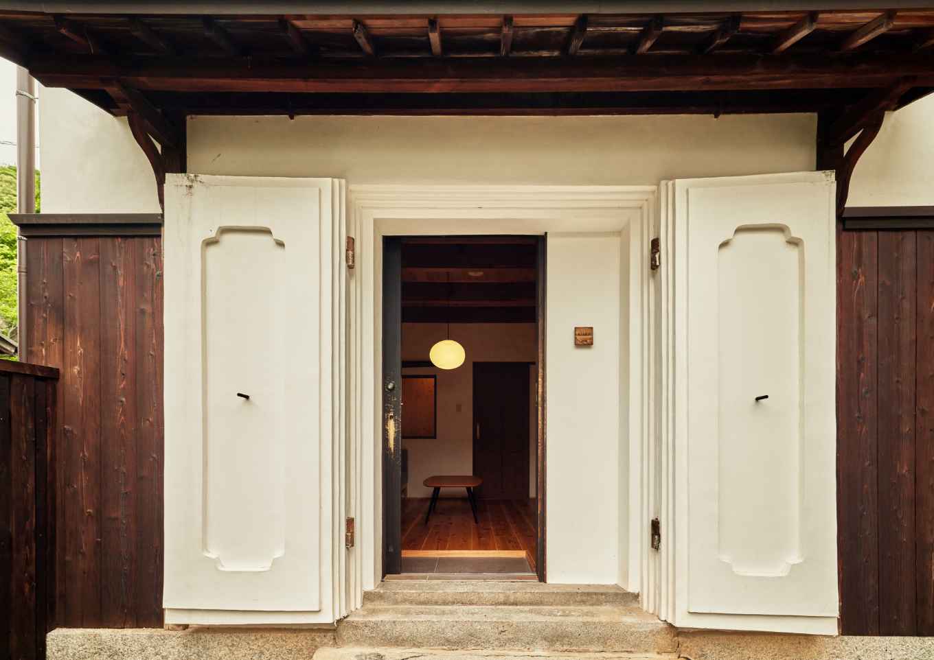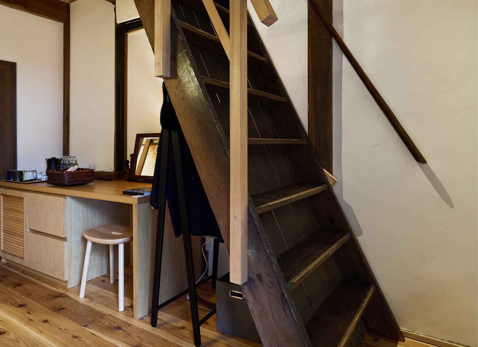 当時のまま残る階段や、向かいに位置する市指定重要文化財「旧松阪家住宅」など、歴史あるまち並みの中に溶け込むように建っています。